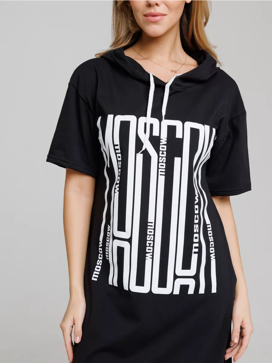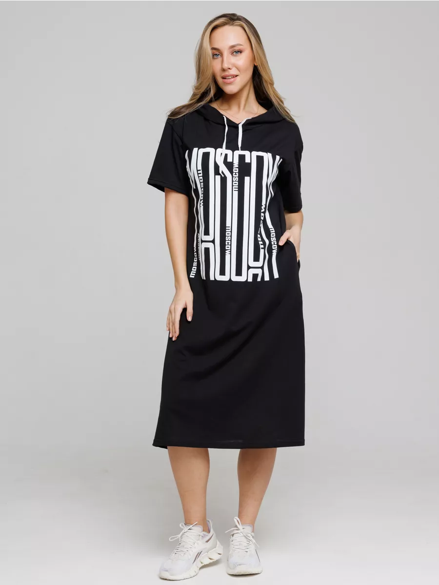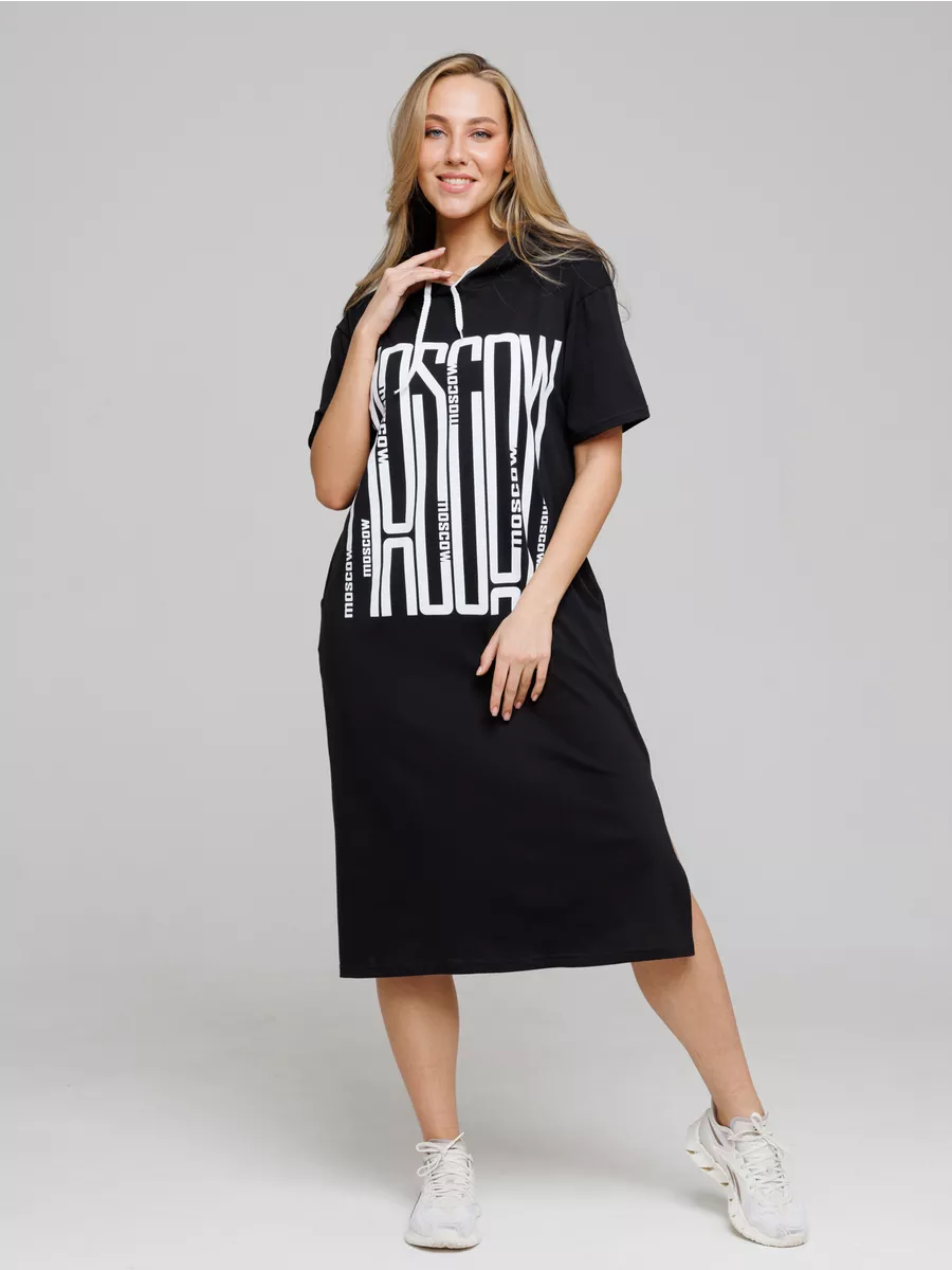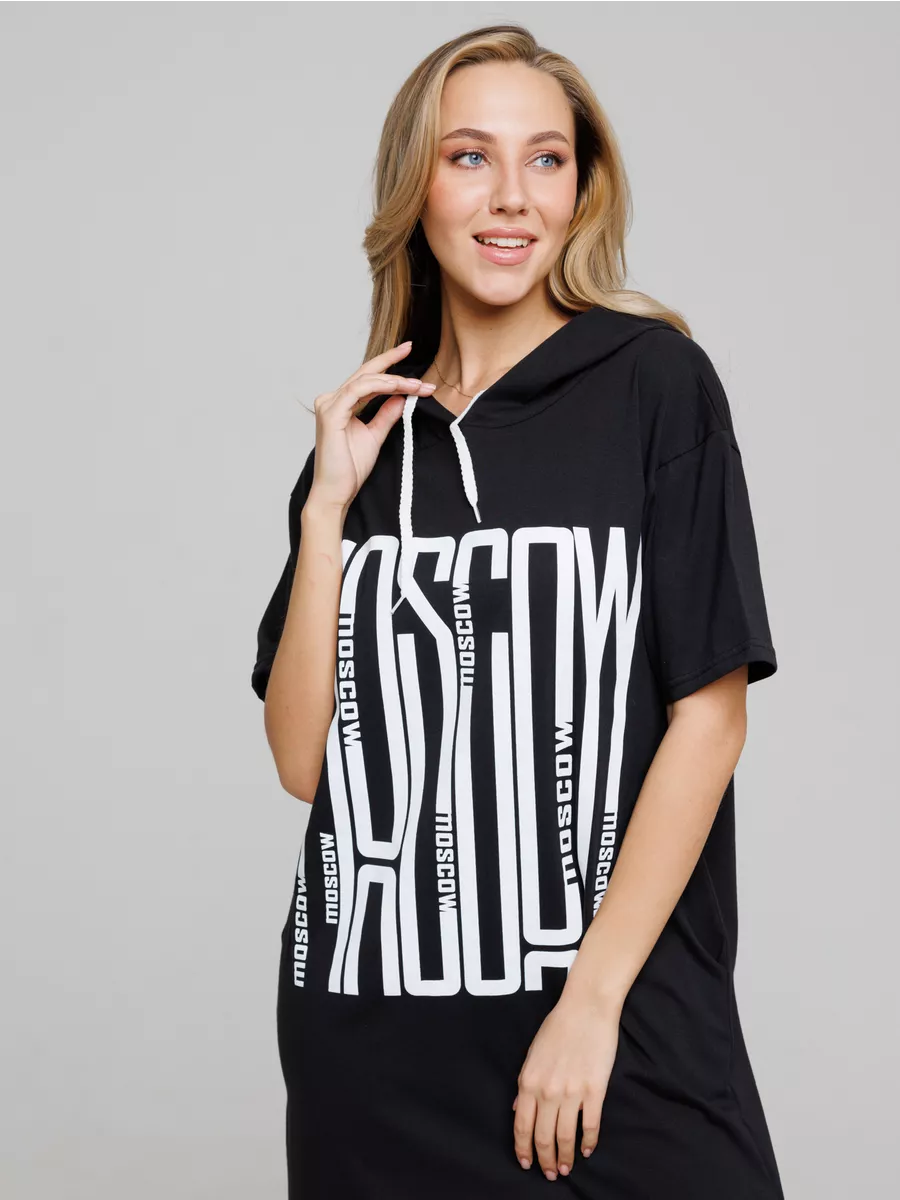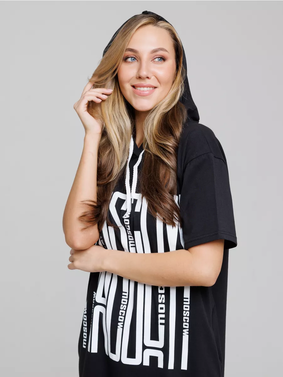 Удлиненная черная трикотажная туника домашняя женская и на каждый день. Широкий размерный ряд, где есть большие размеры. Выполнена из 100 % хлопка, кулирной глади - футболочный трикотаж. Благодаря длине рукава и длине самого платья , длинная туника подойдет для носки и зимой и осенью, будет удобна как теплая. Удобная стильная хлопковая туника подойдет, как домашняя туника платье и в качестве повседневной на каждый день. Нейтральный принт позволить носить ее в качестве офисной туники ( для офиса ). Будет уместна она и как летняя на повседневную носку и как туника пляжная для отдыха на море и в качестве пляжной накидки на купальник. Капюшон защитит Вас от солнца. Туника, прикрывающая ноги, имеет проверенный крой, свободный и не облегающий фигуру, не ограничивает движений, что важно для беременных или полных женщин. Длинная туника с разрезами по бокам имеет прямой фасон с высокой посадкой, который скроет лишние сантиметры. Благодаря свободному покрою такая одежда для дома и на каждый день хорошо смотрится на разных типах женской фигуры - подойдет и для большой груди, и пышных бедер. Платье-туника - отличный подарок для девушек и женщин!