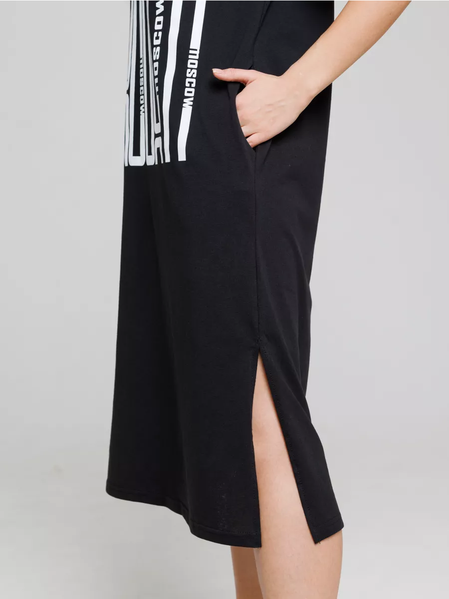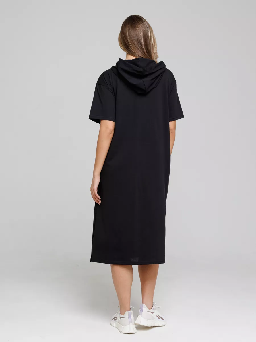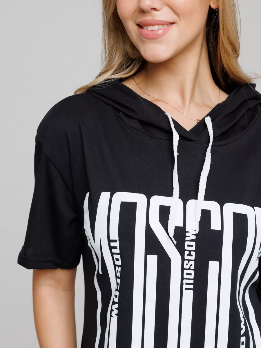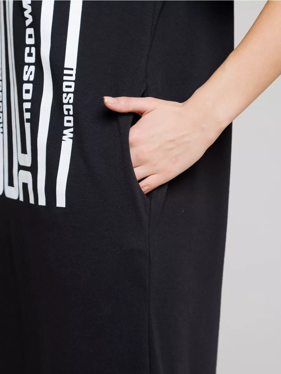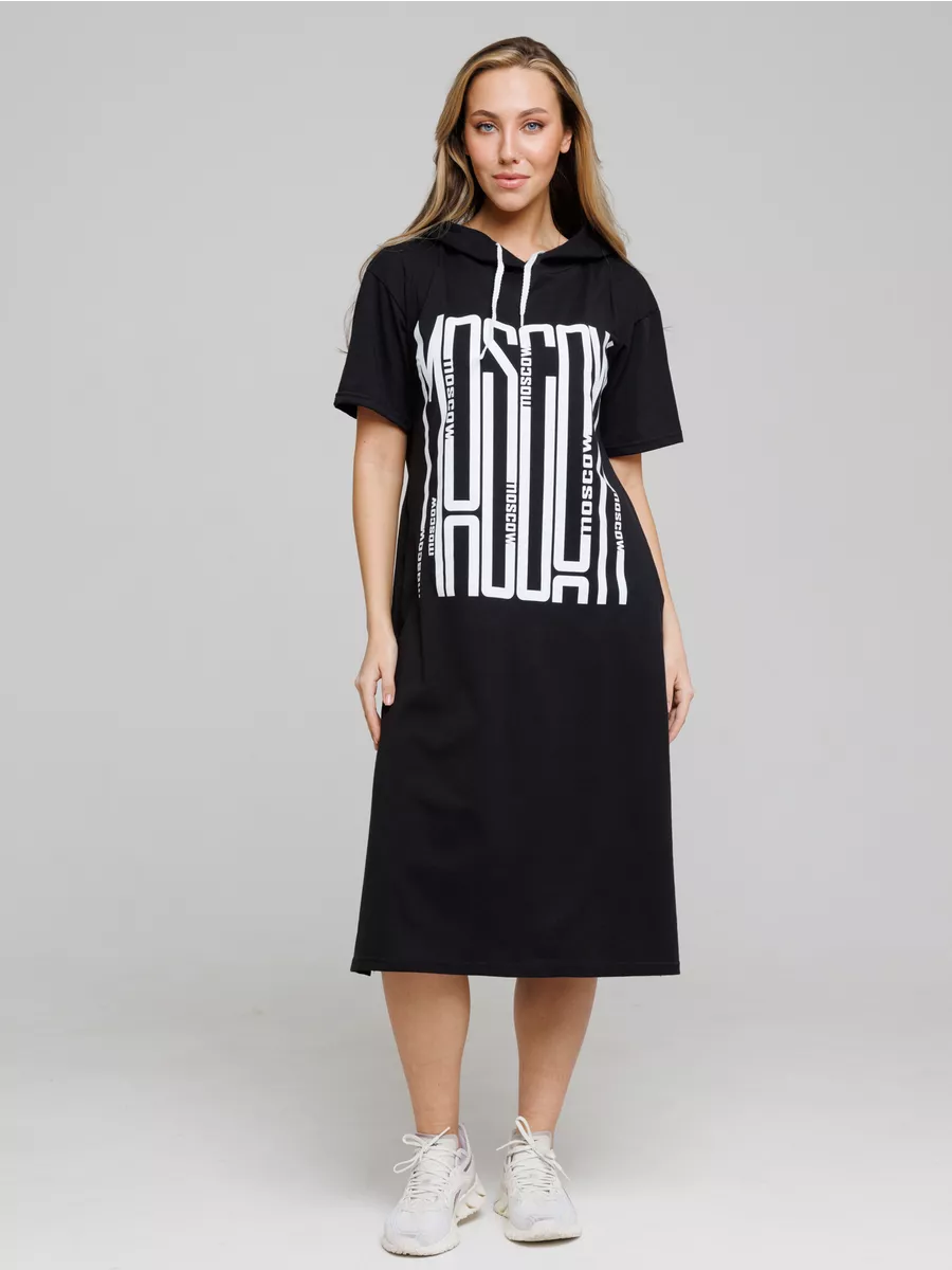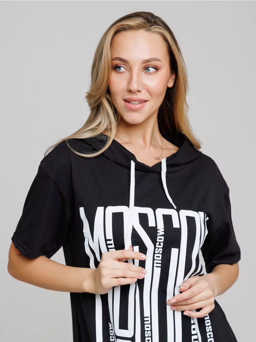 Удлиненная черная трикотажная туника домашняя женская и на каждый день. Широкий размерный ряд, где есть большие размеры. Выполнена из 100 % хлопка, кулирной глади - футболочный трикотаж. Благодаря длине рукава и длине самого платья , длинная туника подойдет для носки и зимой и осенью, будет удобна как теплая. Удобная стильная хлопковая туника подойдет, как домашняя туника платье и в качестве повседневной на каждый день. Нейтральный принт позволить носить ее в качестве офисной туники ( для офиса ). Будет уместна она и как летняя на повседневную носку и как туника пляжная для отдыха на море и в качестве пляжной накидки на купальник. Капюшон защитит Вас от солнца. Туника, прикрывающая ноги, имеет проверенный крой, свободный и не облегающий фигуру, не ограничивает движений, что важно для беременных или полных женщин. Длинная туника с разрезами по бокам имеет прямой фасон с высокой посадкой, который скроет лишние сантиметры. Благодаря свободному покрою такая одежда для дома и на каждый день хорошо смотрится на разных типах женской фигуры - подойдет и для большой груди, и пышных бедер. Платье-туника - отличный подарок для девушек и женщин!