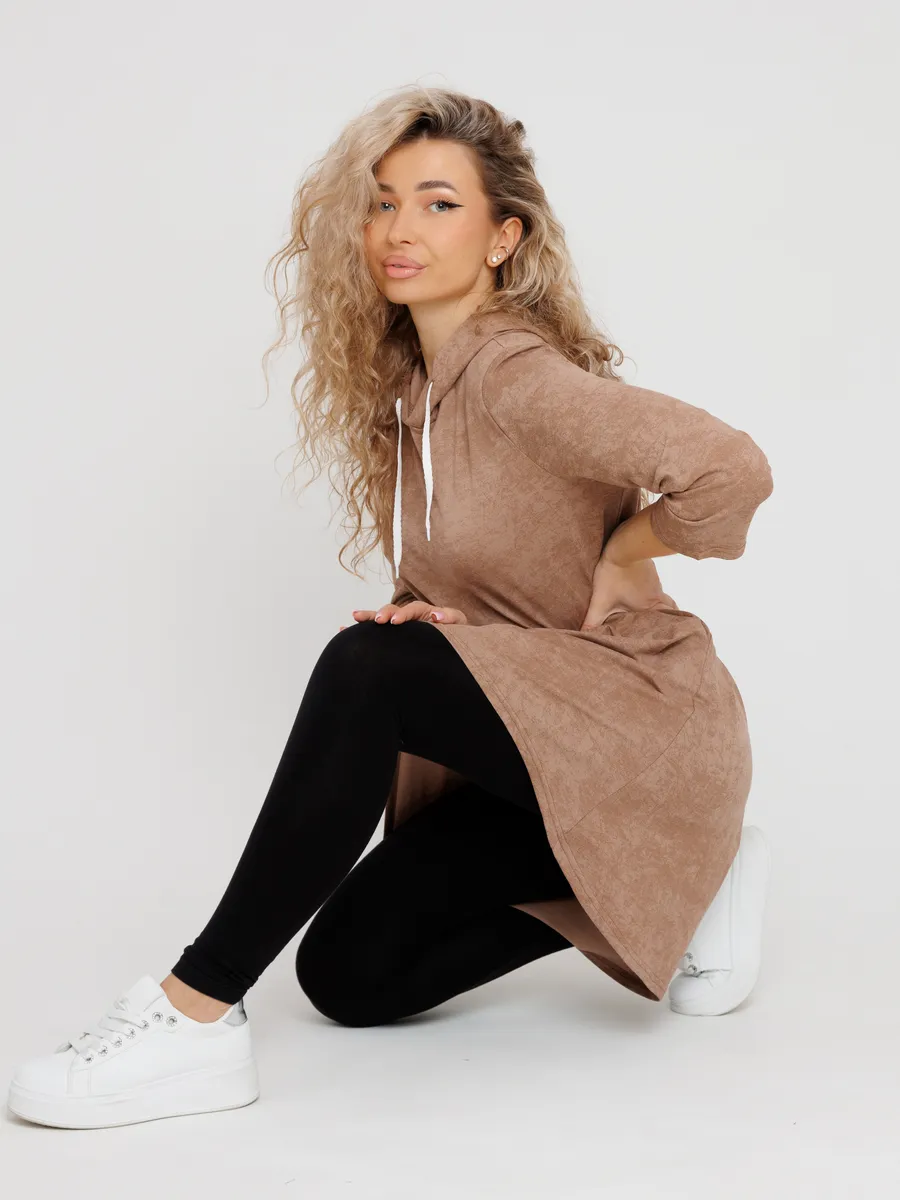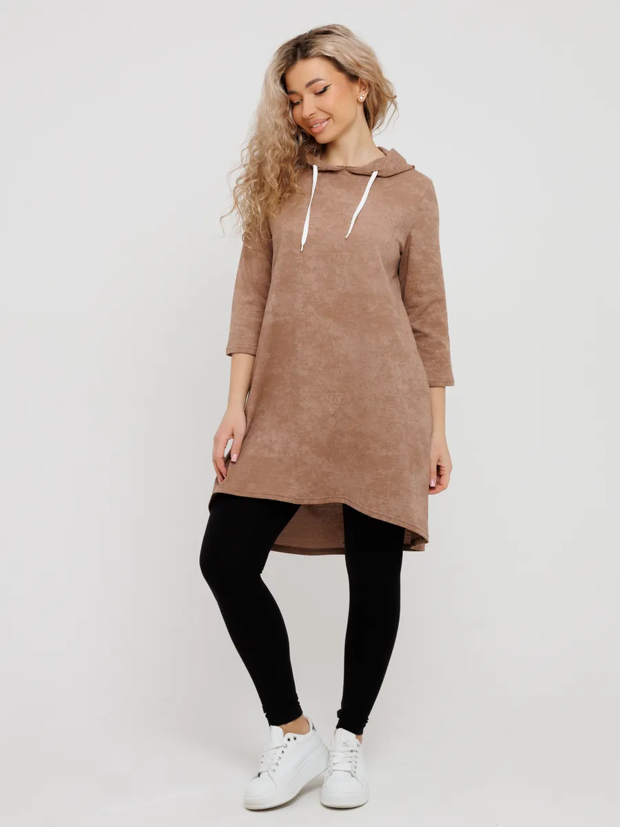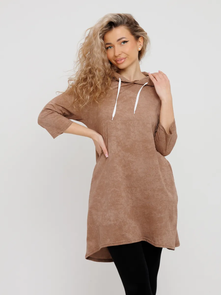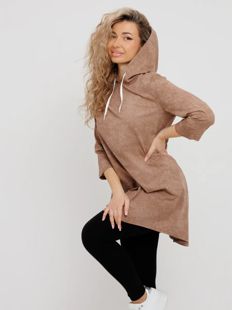 Удлиненная черная трикотажная туника домашняя женская и на каждый день. Широкий размерный ряд, есть большие размеры. Выполнена из 100 % хлопка, кулирной глади - футболочный трикотаж. Благодаря длине рукава и длине самого платья , длинная туника подойдет для носки и зимой и осенью, будет удобна как теплая туника . Удобная стильная хлопковая туника подойдет как домашняя туника и в качестве повседневной на каждый день. Нейтральный принт позволить носить ее в качестве офисной. Будет уместна она и как летняя на повседневную носку и как туника пляжная для отдыха на море и в качестве пляжной накидки на купальник. Длинные рукава и капюшон защитят вас от солнца. Туника , прикрывающая бедра, отлична как платье туника, либо ее можно носить дополнив образ лосинами, велосипедками или джинсами. Кофта имеет проверенный крой, свободный и не облегающий фигуру, не ограничивает движений, что важно для беременных или полных женщин. А – силуэт трапеция с ассиметричной длиной не акцентирует линию талии в худи, расклешенный фасон с высокой посадкой сбалансирует фигуру с широкими плечами, скроет лишние сантиметры в бедрах. Благодаря свободному покрою такая одежда для дома и на каждый день хорошо смотрится на разных типах женской фигуры - подойдет и для большой груди, и пышных бедер.