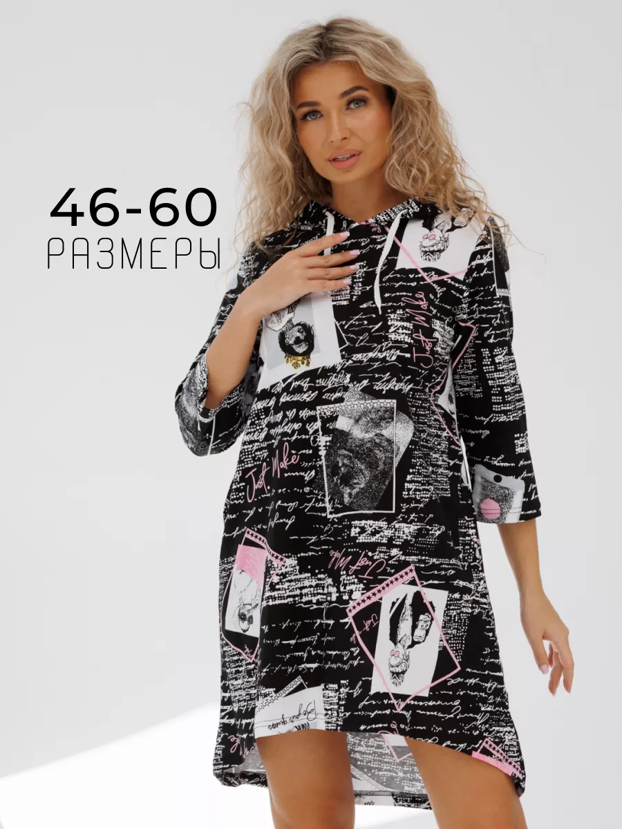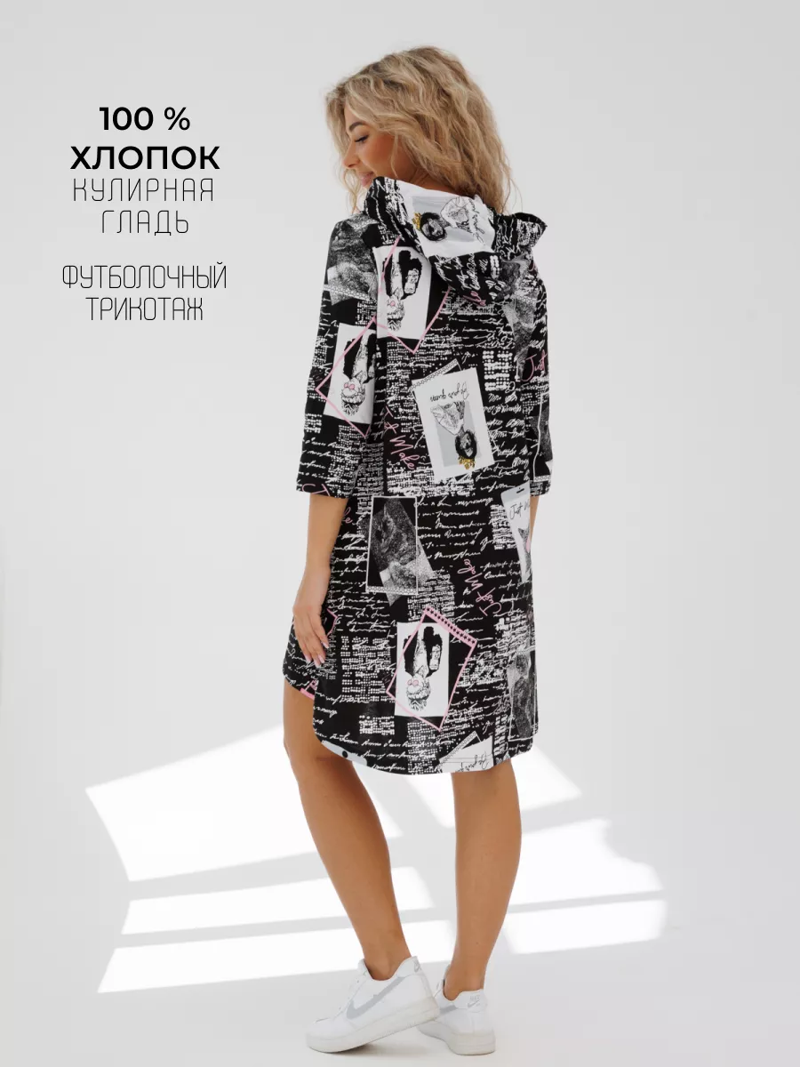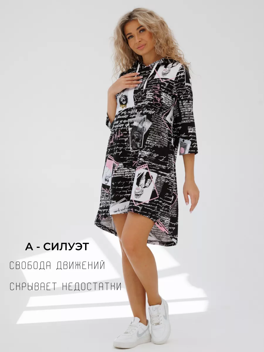 Удлиненная черная трикотажная туника домашняя женская и на каждый день. Широкий размерный ряд, есть большие размеры. Выполнена из 100 % хлопка, кулирной глади - футболочный трикотаж. Благодаря длине рукава и длине самого платья , длинная туника подойдет для носки и зимой и осенью и будет удобна как теплая. Удобная стильная хлопковая и с ярким принтом, она подойдет как домашняя и в качестве повседневной. Нейтральный цвет позволить носить ее в качестве офисной и в качестве блузки и туники (для офиса). Будет уместна она и как летняя на повседневную носку и как туника пляжная для отдыха на море и в качестве пляжной накидки на купальник. Длинные рукава и капюшон защитят вас от солнца. Туника , прикрывающая бедра, отлична сама по себе, либо ее можно носить дополнив образ лосинами, велосипедками или джинсами. Имеет проверенный крой, свободный и не облегающий фигуру, не ограничивает движений, что важно для беременных или полных женщин. А – силуэт трапеция с ассиметричной длиной не акцентирует линию талии, расклешенный фасон с высокой посадкой сбалансирует фигуру с широкими плечами, скроет лишние сантиметры в бедрах. Благодаря свободному покрою такая одежда для дома и на каждый день хорошо смотрится на разных типах женской фигуры - подойдет и для большой груди, и пышных бедер.