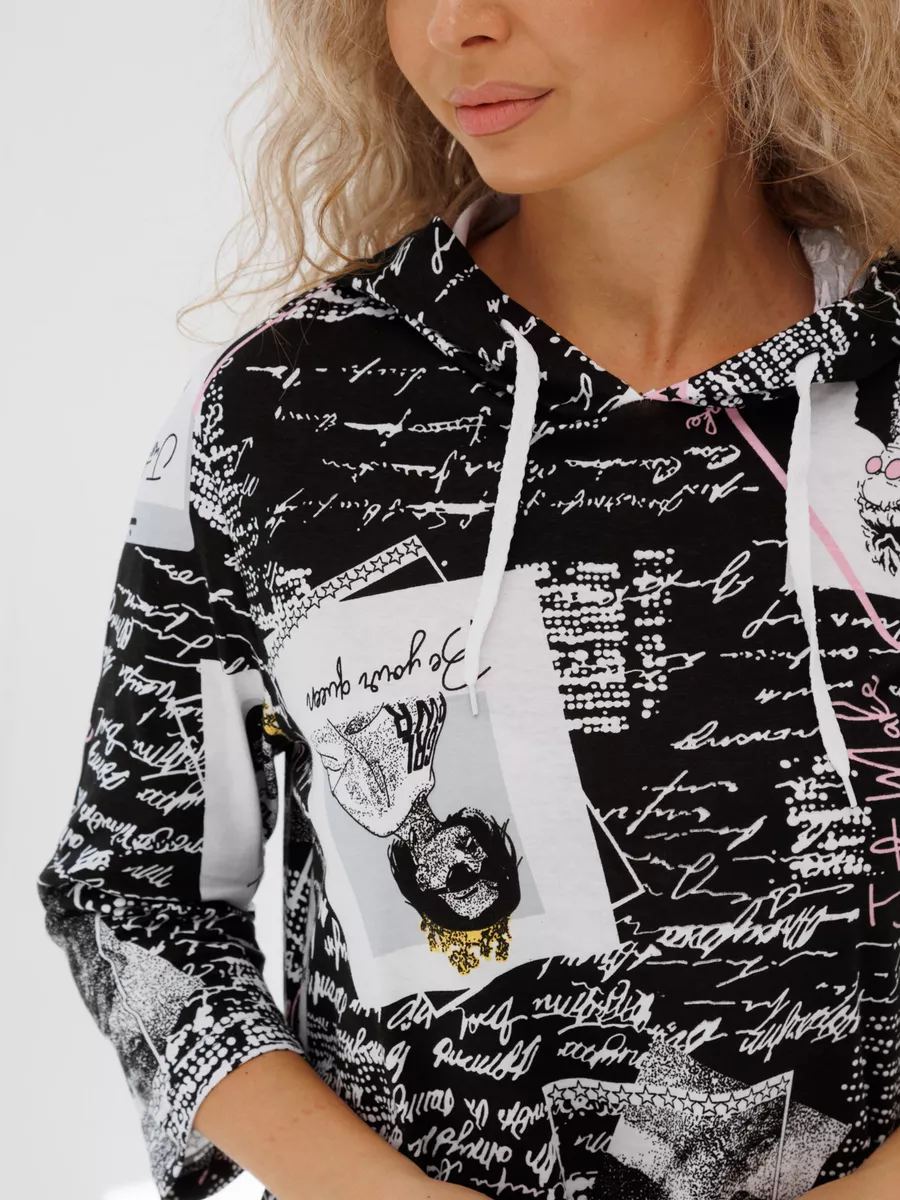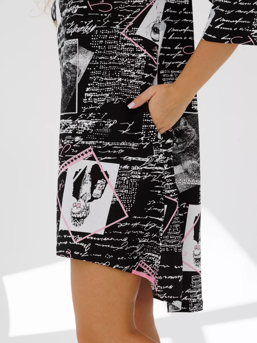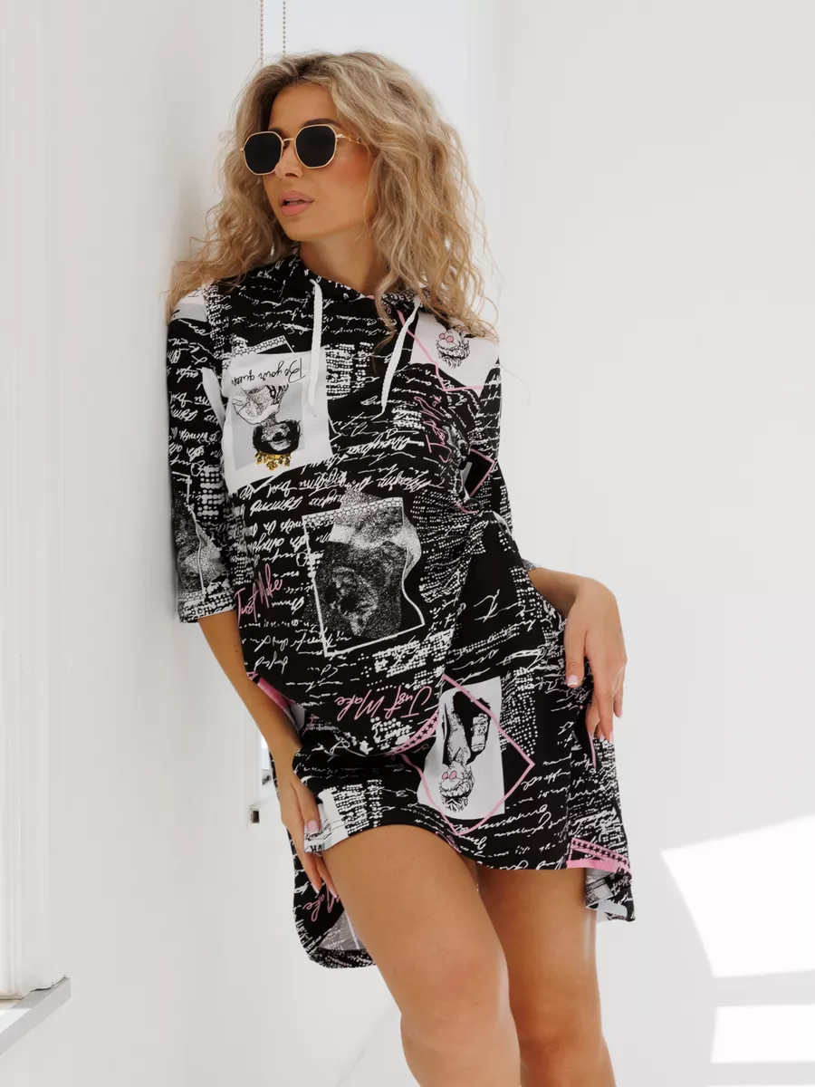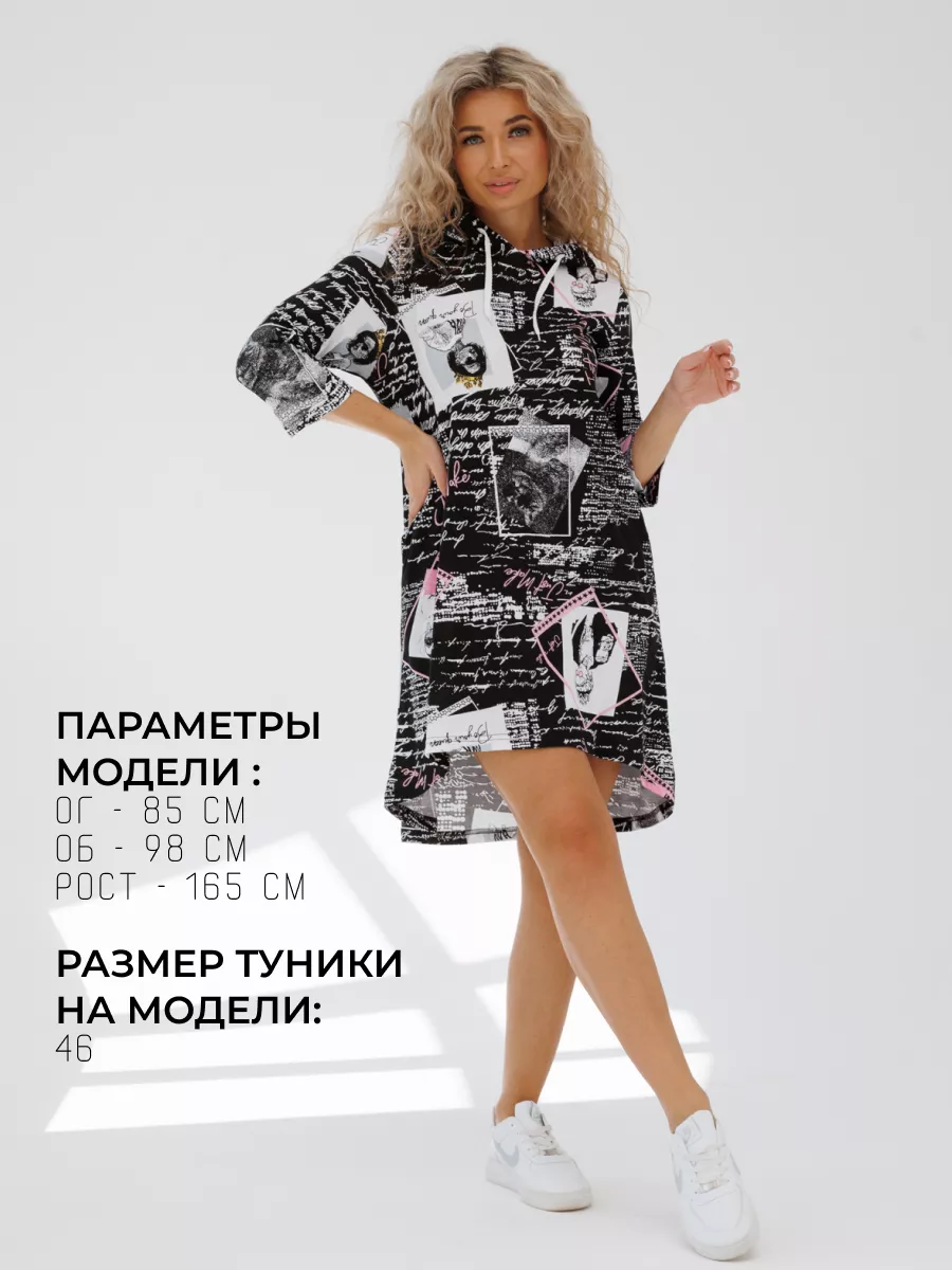 Удлиненная черная трикотажная туника домашняя женская и на каждый день. Широкий размерный ряд, есть большие размеры. Выполнена из 100 % хлопка, кулирной глади - футболочный трикотаж. Благодаря длине рукава и длине самого платья , длинная туника подойдет для носки и зимой и осенью и будет удобна как теплая. Удобная стильная хлопковая и с ярким принтом, она подойдет как домашняя и в качестве повседневной. Нейтральный цвет позволить носить ее в качестве офисной и в качестве блузки и туники (для офиса). Будет уместна она и как летняя на повседневную носку и как туника пляжная для отдыха на море и в качестве пляжной накидки на купальник. Длинные рукава и капюшон защитят вас от солнца. Туника , прикрывающая бедра, отлична сама по себе, либо ее можно носить дополнив образ лосинами, велосипедками или джинсами. Имеет проверенный крой, свободный и не облегающий фигуру, не ограничивает движений, что важно для беременных или полных женщин. А – силуэт трапеция с ассиметричной длиной не акцентирует линию талии, расклешенный фасон с высокой посадкой сбалансирует фигуру с широкими плечами, скроет лишние сантиметры в бедрах. Благодаря свободному покрою такая одежда для дома и на каждый день хорошо смотрится на разных типах женской фигуры - подойдет и для большой груди, и пышных бедер.