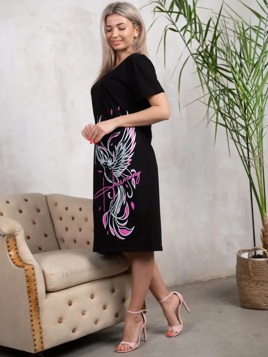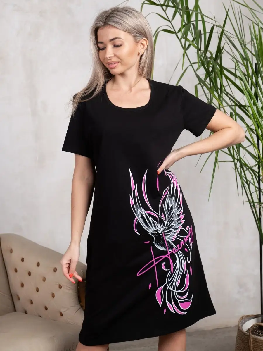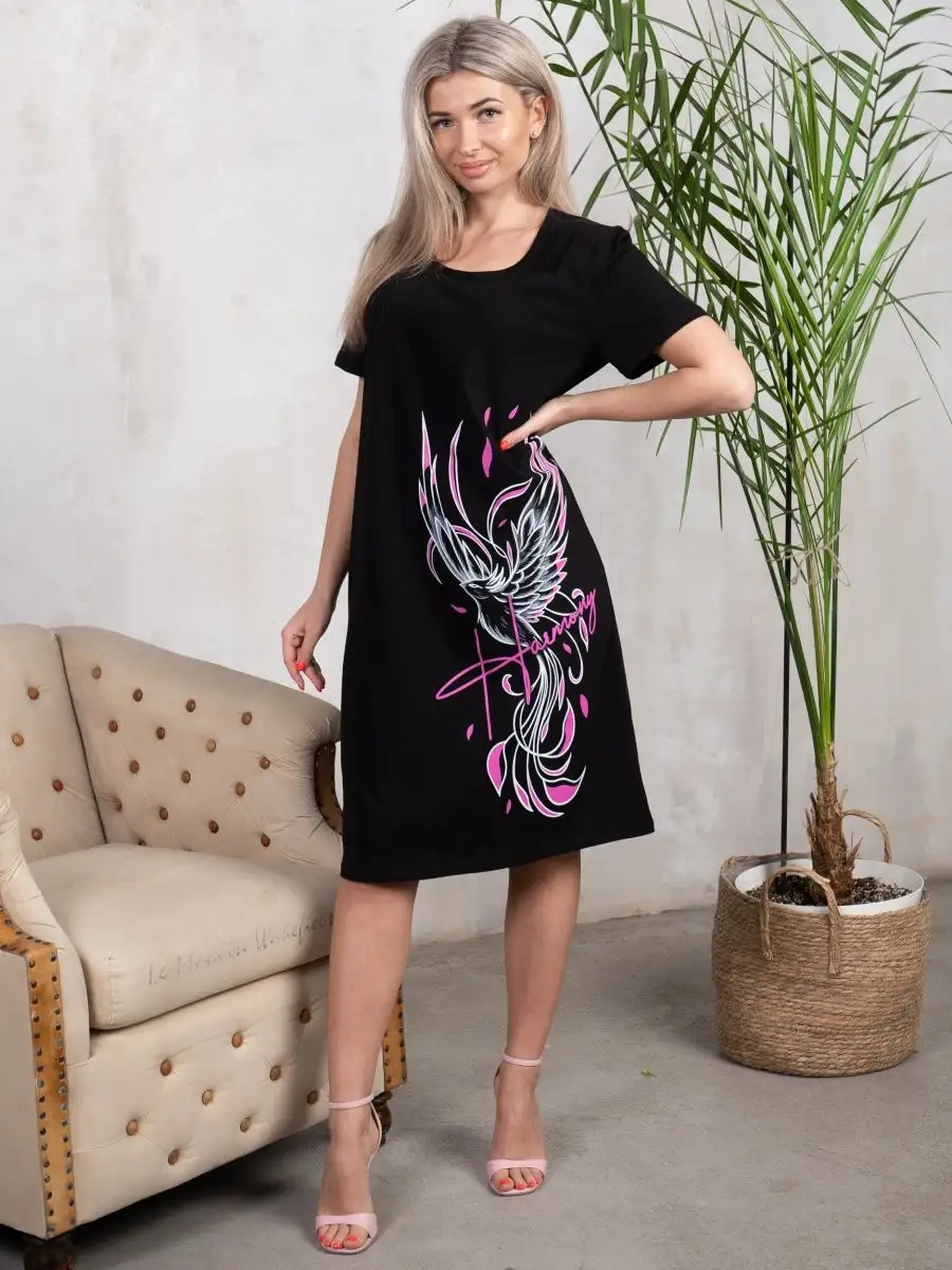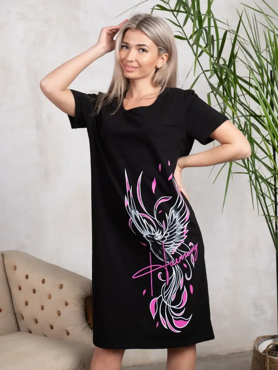 В фотогалерее вы можете ознакомиться с размерной сеткой и рекомендациями по уходу. Удлиненная трикотажная туника с принтом и коротким рукавом, есть большие размеры. Выполнена из 100% хлопка. Удобная хлопковая туника платье подойдет вам в прохладное время года как повседневная домашняя нарядная для дома и как летняя на каждый день, а так же на лето для пляжа, в качестве пляжной накидки на купальник. Проверенный крой, свободный и не облегающий фигуру, не ограничивает движений, что немаловажно для беременных или полных женщин. А - силуэт с длиной миди, чуть выше колена интересно смотрится. Высокая свободная посадка не акцентирует линию талии, расклешенный фасон сбалансирует фигуру с широкими плечами, скроет лишние сантиметры в бедрах. Благодаря свободному покрою такая одежда для дома и на выход хорошо смотрится на разных типах женской фигуры - подойдет и для большой груди, и пышных бедер. В наличии есть туники больших размеров, силуэт будет удобен для полных и для беременных девушек. Платье-туника - это отличный подарок для девушек и женщин! Тысячи женщин уже по достоинству оценили их!
